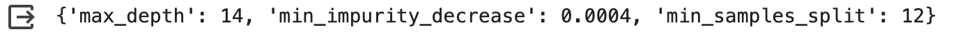 params = {'min_impurity_decrease' : uniform(0.0001, 0.001), 'max_depth': randint(20, 50), 'min_samples_split': randint(2, 25), 'min_samples_leaf': randint(1, 25),}