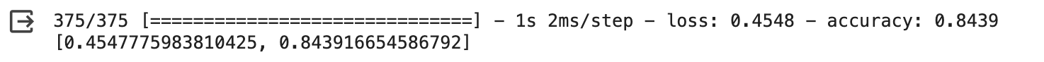 evaluate() 메서드도 fit() 메서드와 비슷한 출력을 보인다.