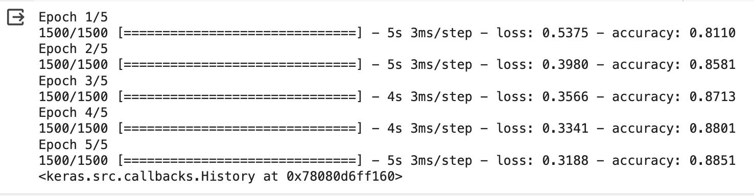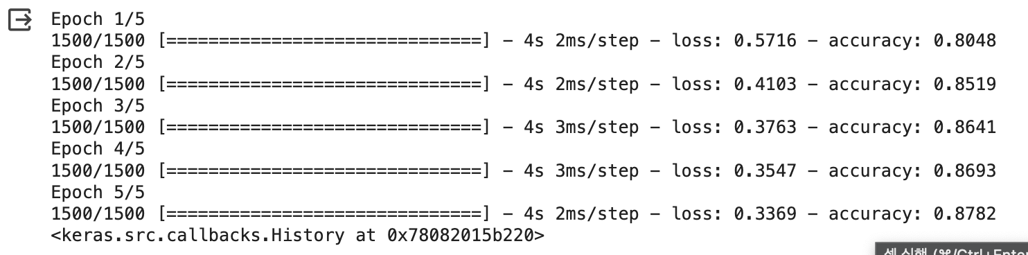 compile() 메서드의 optimizer를 'adam'으로 설정하고 5번의 에포크 동안 훈련한다.