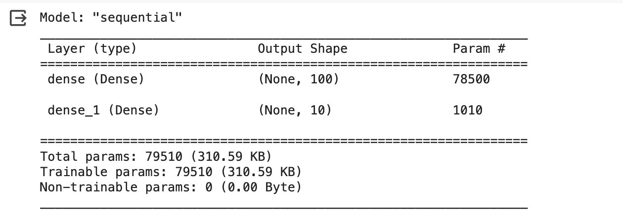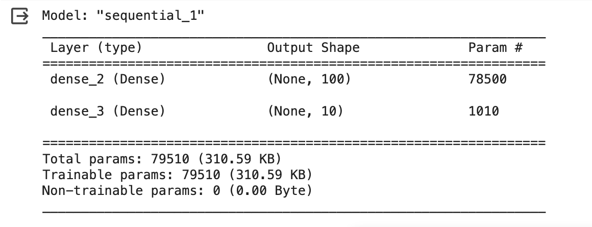 model = keras.Sequential([keras.layers.Dense(100, activation = 'sigmoid', input_shape = (784,), name = 'hidden'),