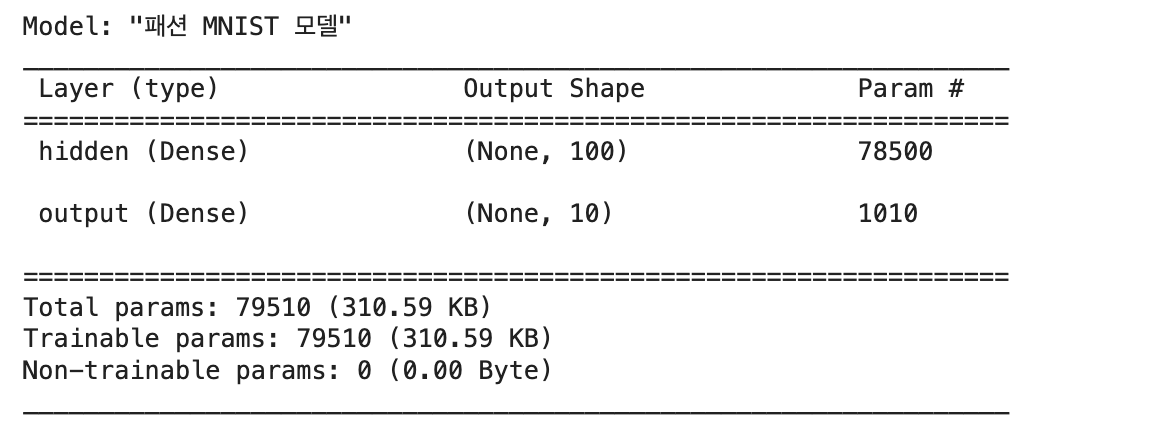 summary() 메서드의 마지막에는 총 모델 파라미터 개수와 훈련되는 파라미터 개수가 동일하게 79,510개로 나온다. 은닉층과 출력층의 파라미터 개수를 합친 값이다. 그 아래 훈련되지 않은 파라미터(Non-trainable params)는 0으로 출력되어 있다. 간혹 경사 하강법으로 훈련되지 않는 파라미터를 가진 층이 있는데 이런 층의 파라미터 개수가 여기에 나타나게 된다.