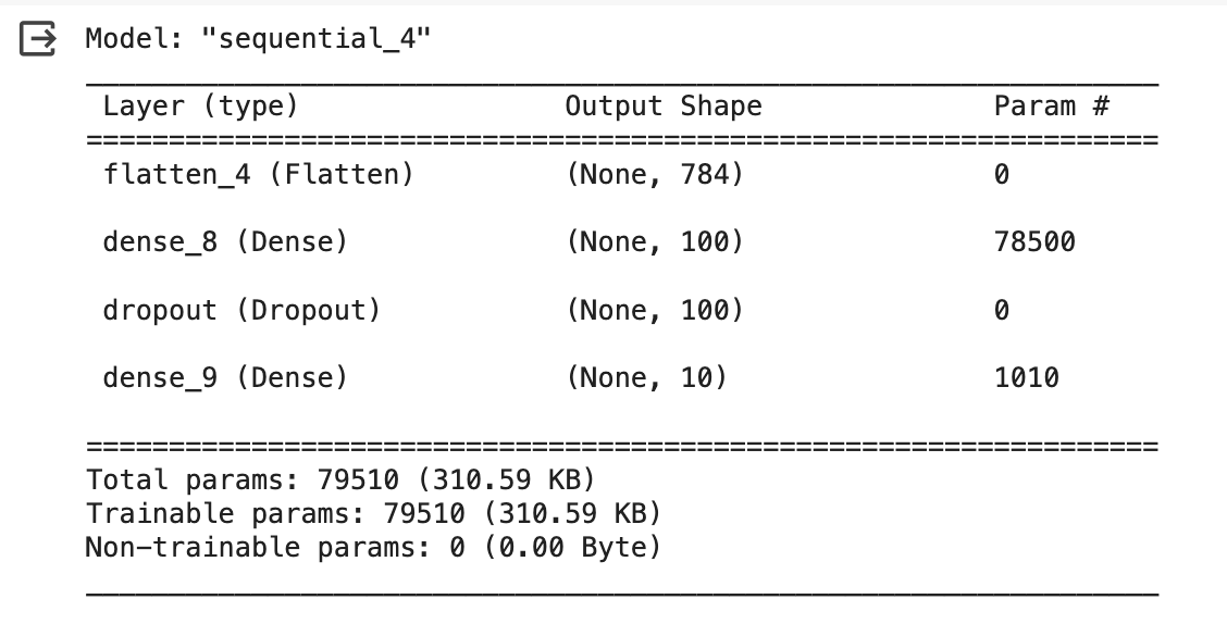 출력 결과에서 볼 수 있듯이 은닉층 뒤에 추가된 드롭아웃 층은 훈련되는 모델 파라미터가 없다. 또한 입력과 출력의 크기가 동일하다. 일부 뉴런의 출력을 0으로 만들지만 전체 출력 배열의 크기를 바꾸지는 않는다는 것을 확인할 수 있다.