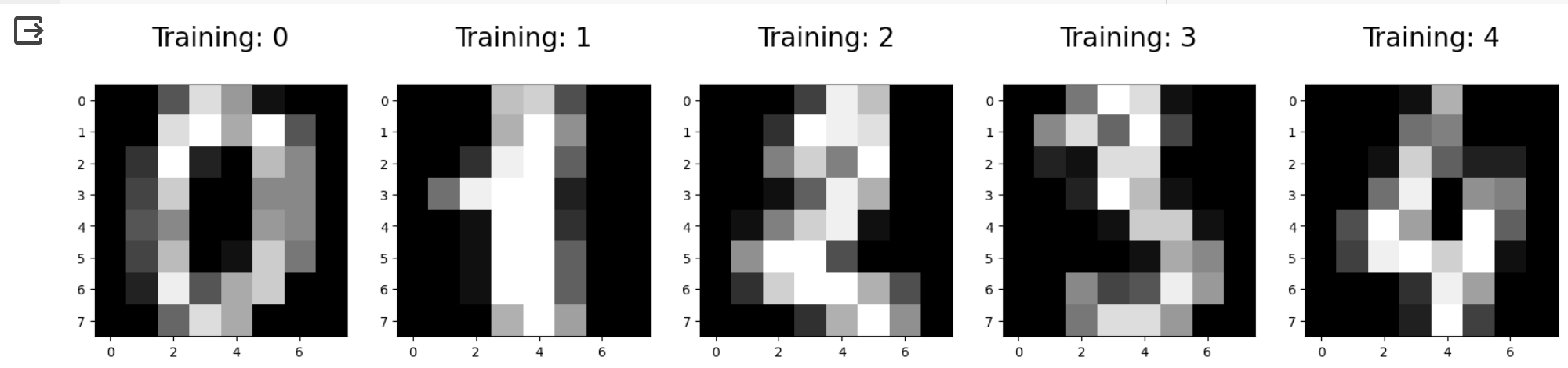 for index, (image, label) in enumerate(zip(digits.data[0:5], digits.target[0:5])):