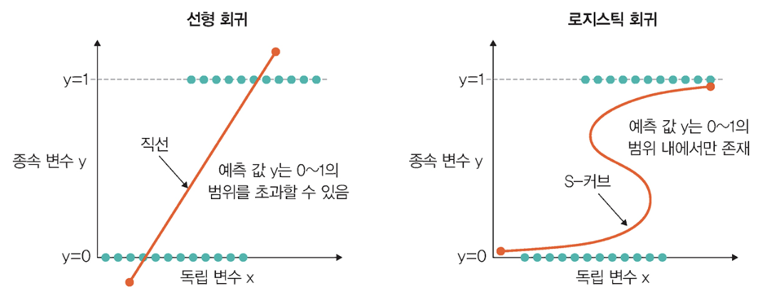 위 그림과 같이 선형 회귀는 직선을 출력하고, 로지스틱 회귀는 S-커브를 출력한다.