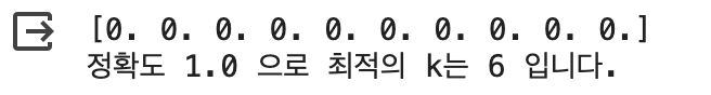 for문을 이용하여 K값을 1부터 10까지 순환하면서 최적의 K값과 정확도를 찾는다.