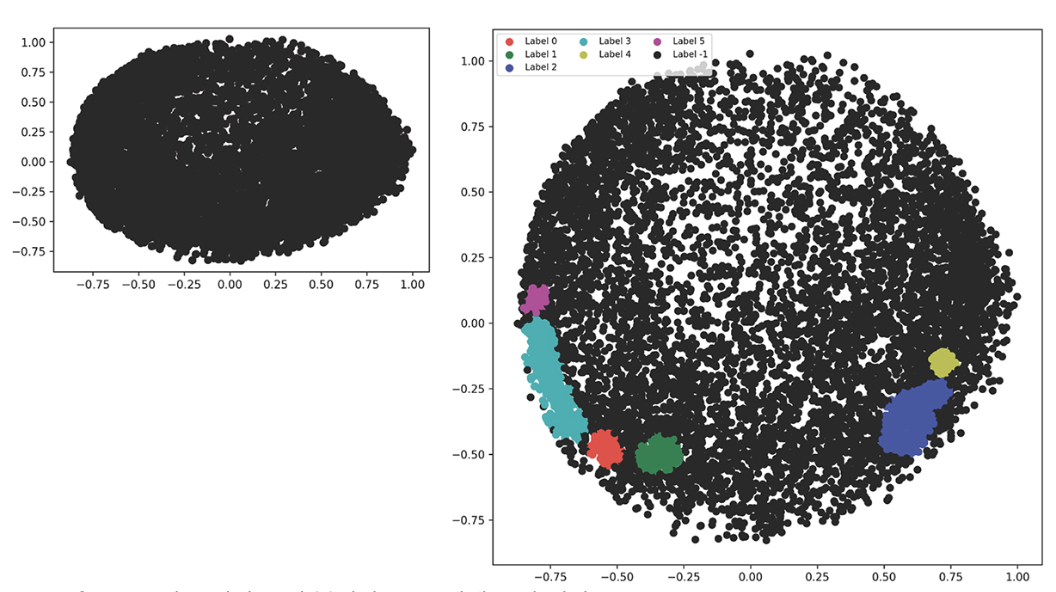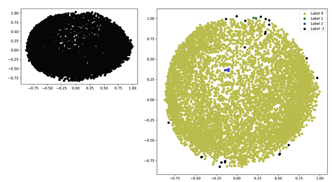 많은 클러스터 부분이 무시된 것을 확인할 수 있다. 하이퍼파라미터 영향에 따라 클러스터 결과(성능)가 달라지므로, 최적의 성능을 내려면 하이퍼파라미터를 이용한 튜닝이 중요하다.