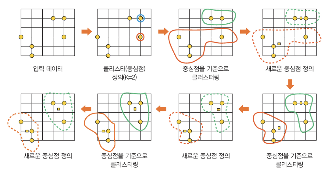 K-평균 군집화는 데이터를 입력받아 소수의 그룹으로 묶는 알고리즘이다. 레이블이 없는 데이터를 입력받아 각 데이터에 레이블을 할당해서 군집화를 수행하는데, 학습 과정은 다음과 같다.