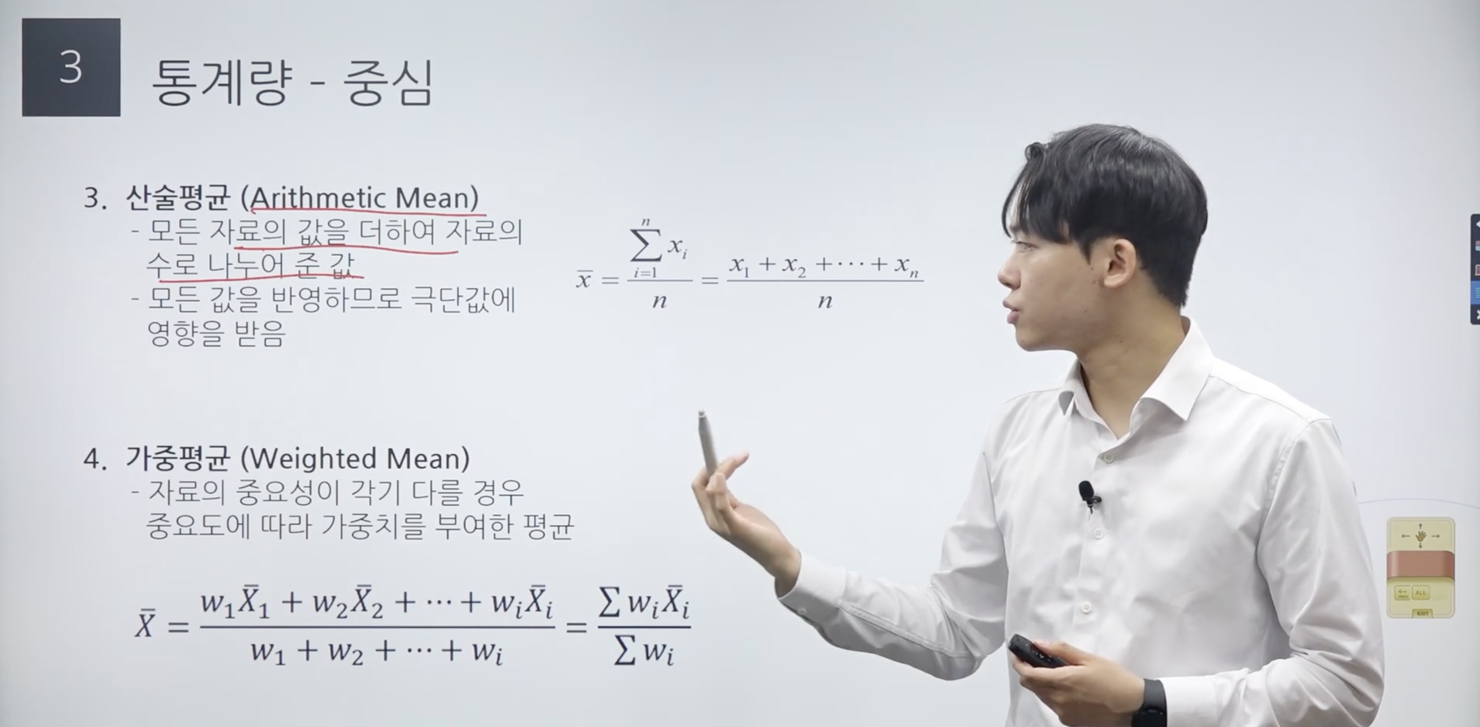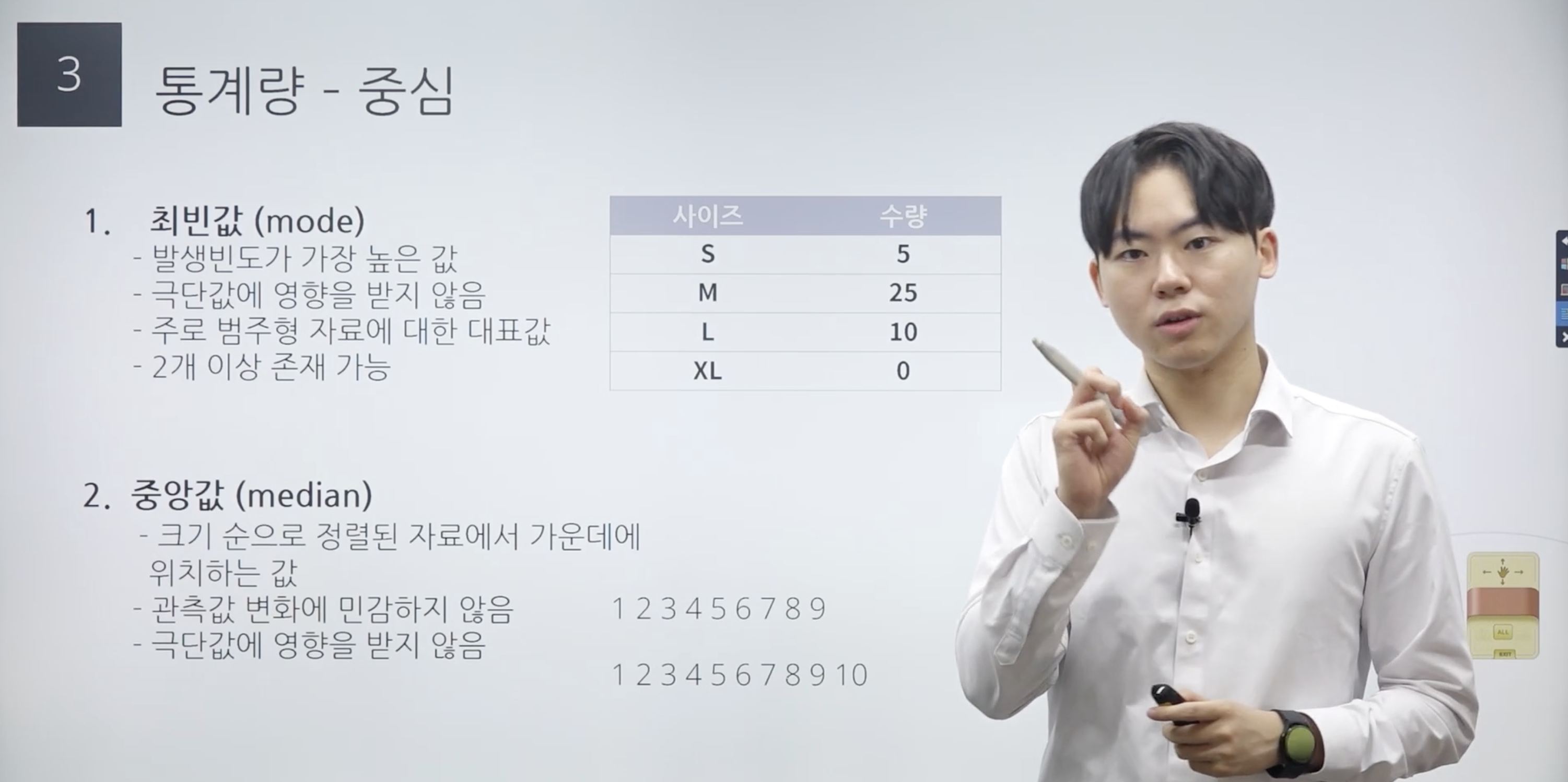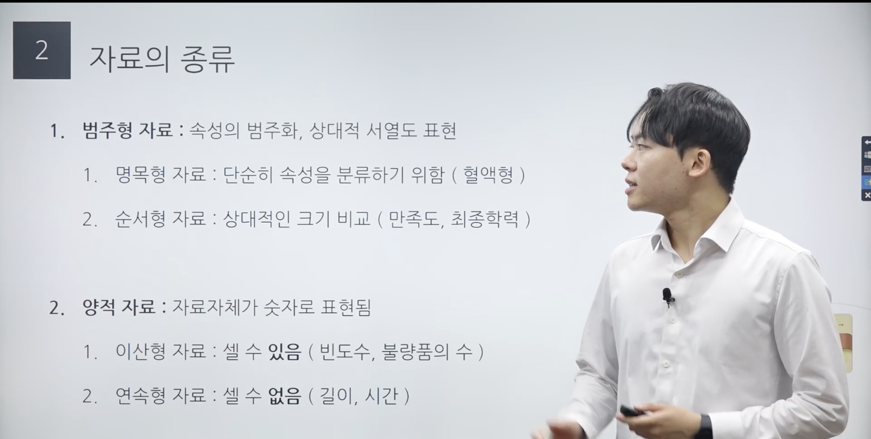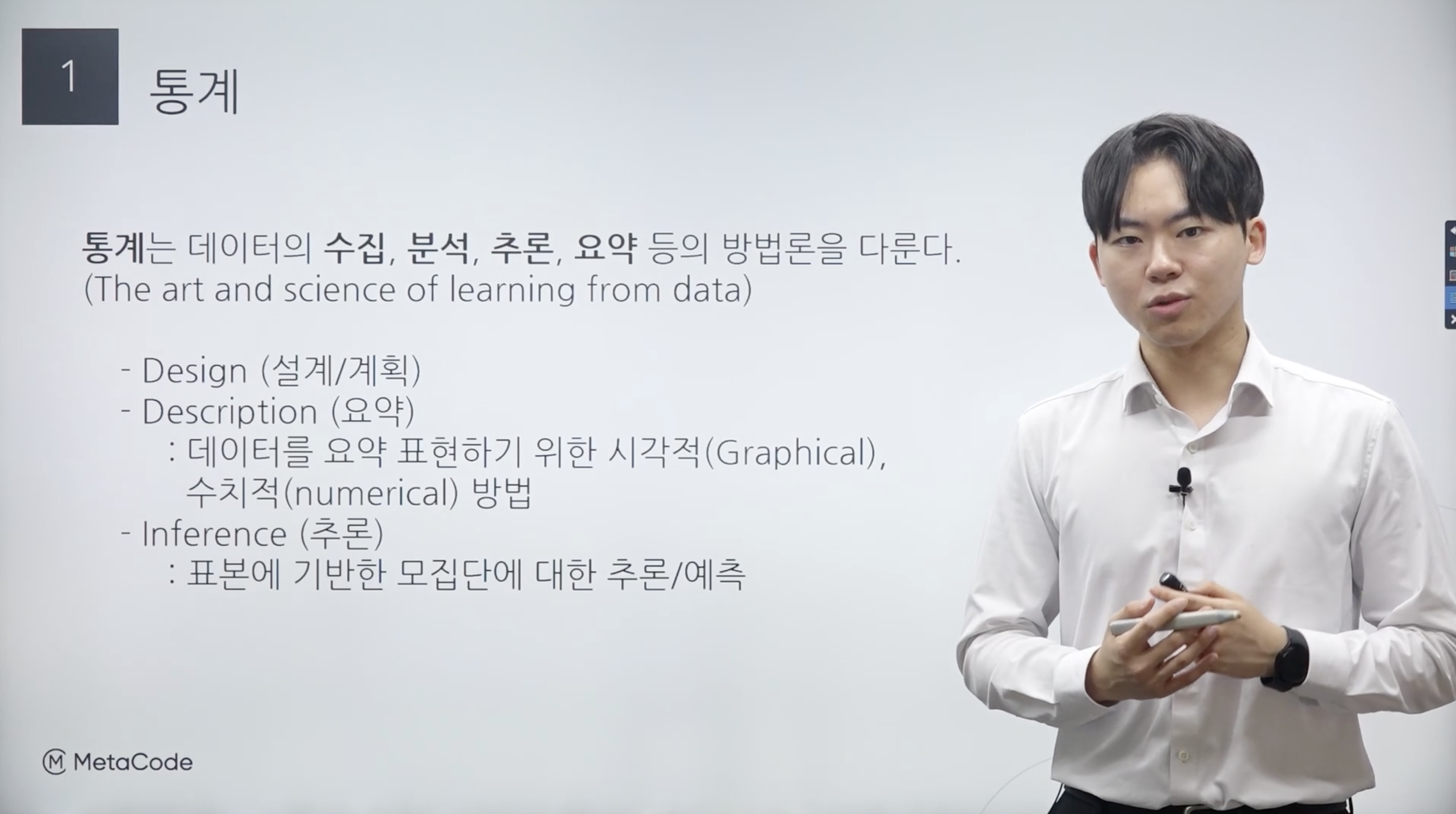 위 내용은 메타코드 "통계 기초의 모든것 올인원"강의의 1편 1강 : 통계량의 "인사/데이터의 종류 소개" 및 "중심"의 요약 내용입니다.