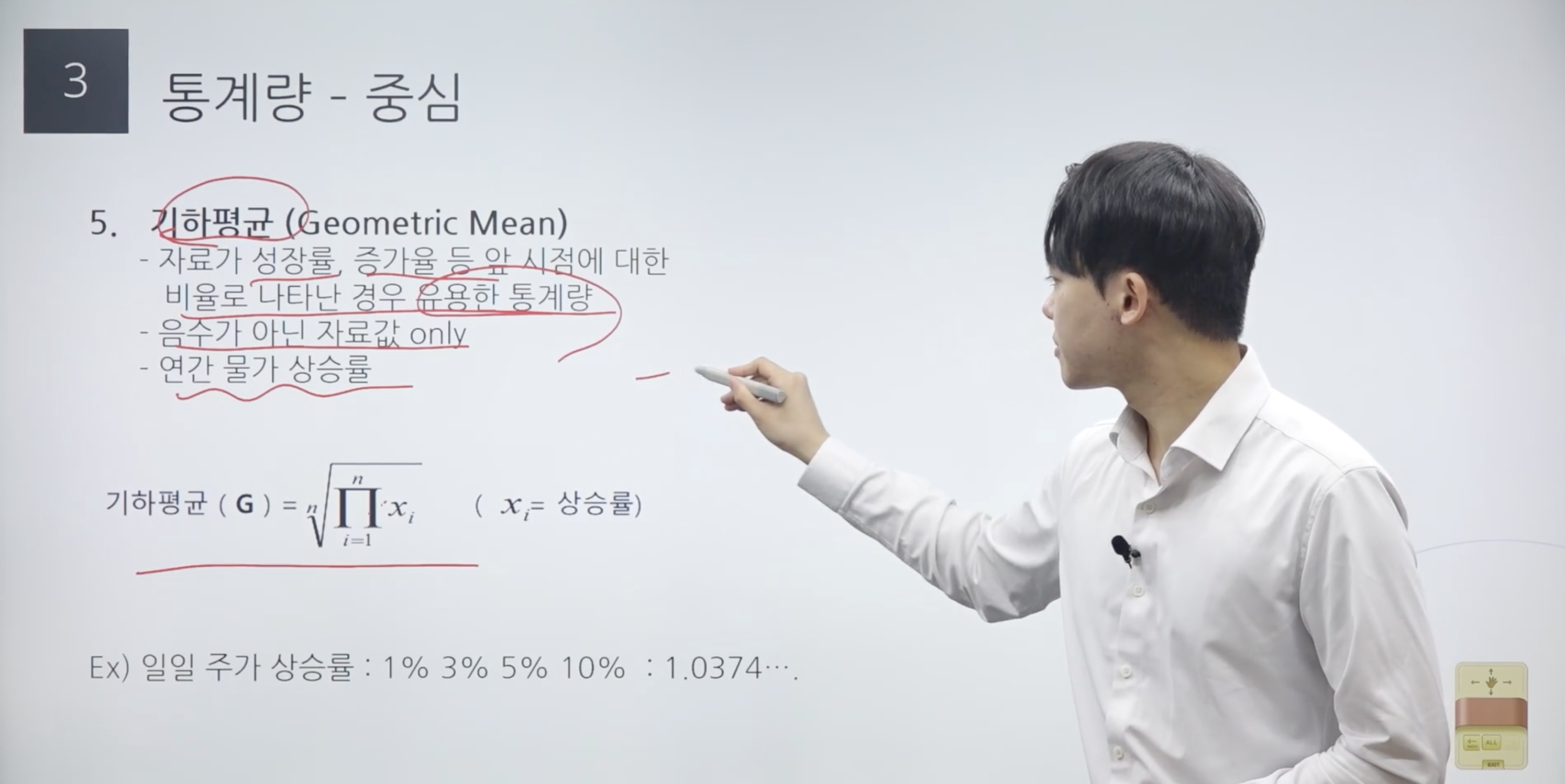 기하평균(geometric mean) : 자료가 성장률, 증가율 등 앞 시점에 대한 비율로 나타난 경우 유용한 통계량
