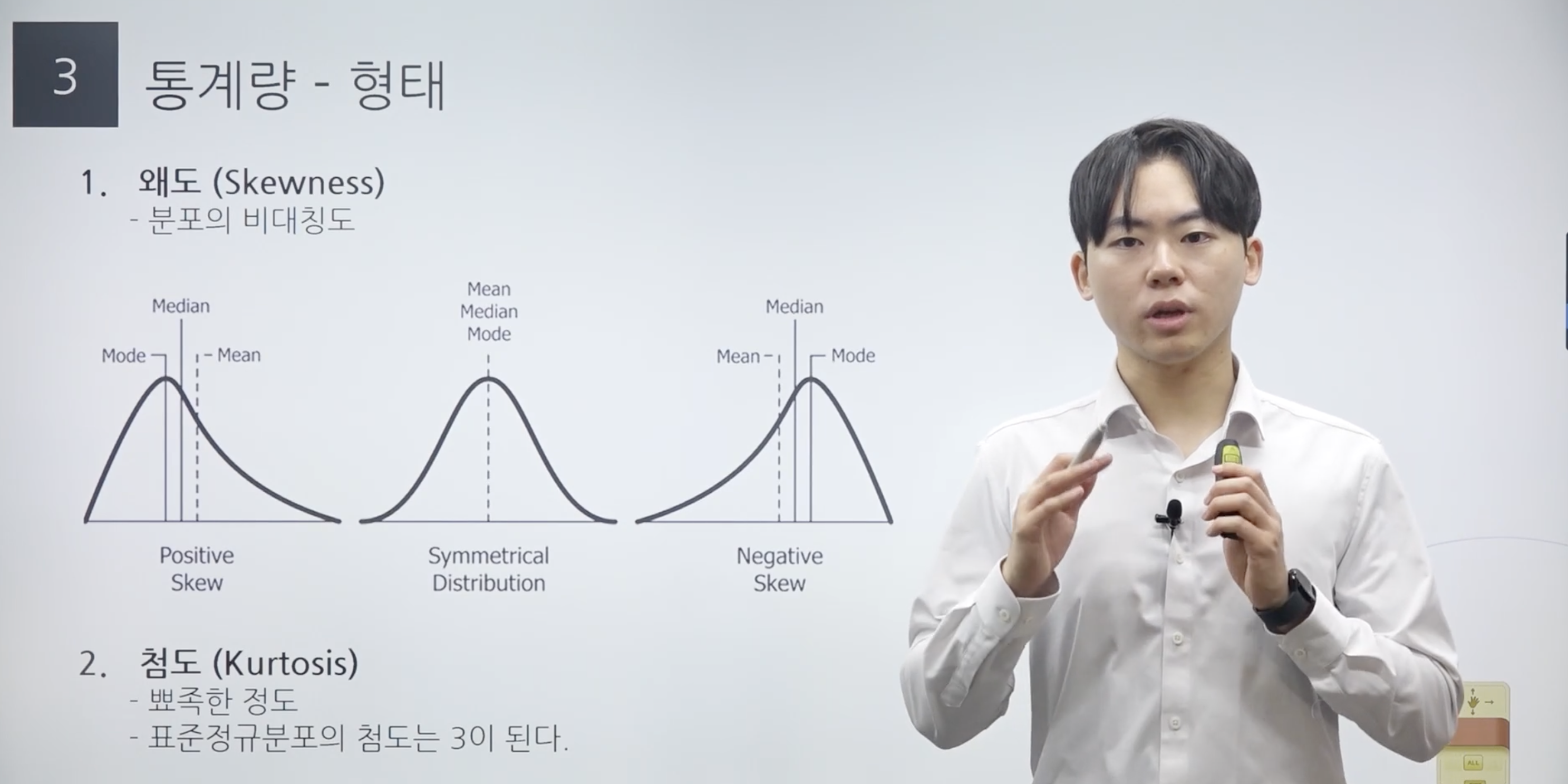 왜도가 0일 경우 분포가 가운데를 기준으로 정확하게 일치하며 mode, median, mean이 정확하게 일치한다.