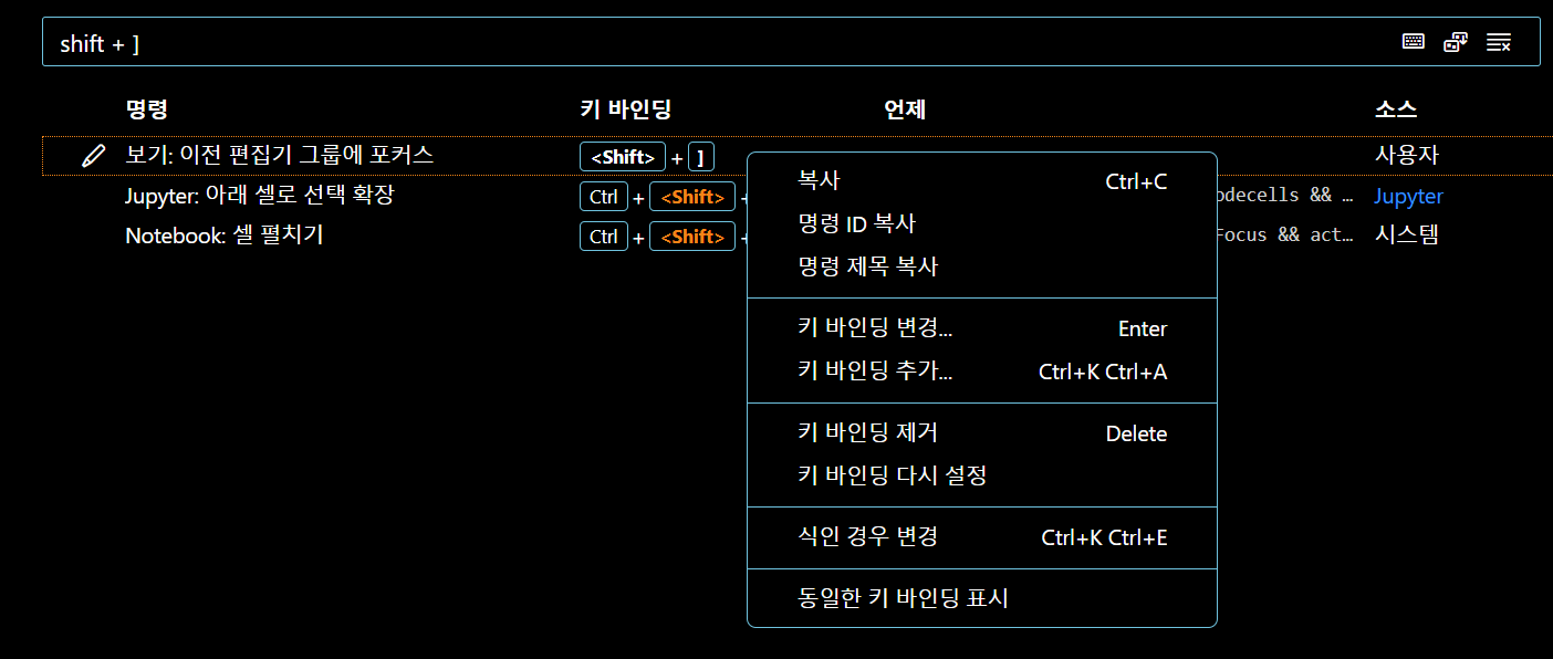 오른쪽 클릭하고 키 바인딩 변경으로 키바인딩 값을 변경한다.