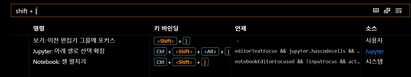 위 설정에 문제가 없다면 단축키 문제일 거라 확신하고 단축키를 찾아보니 shift + ] 에 키 바인딩이 걸려 있었다.