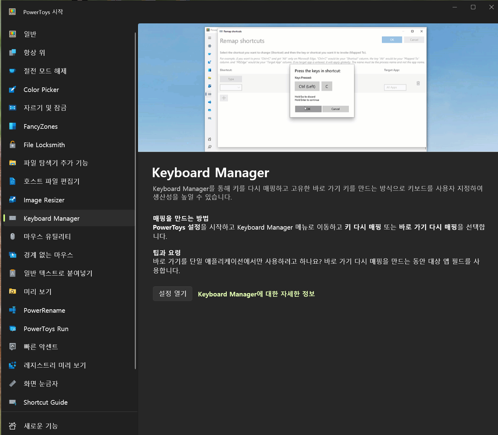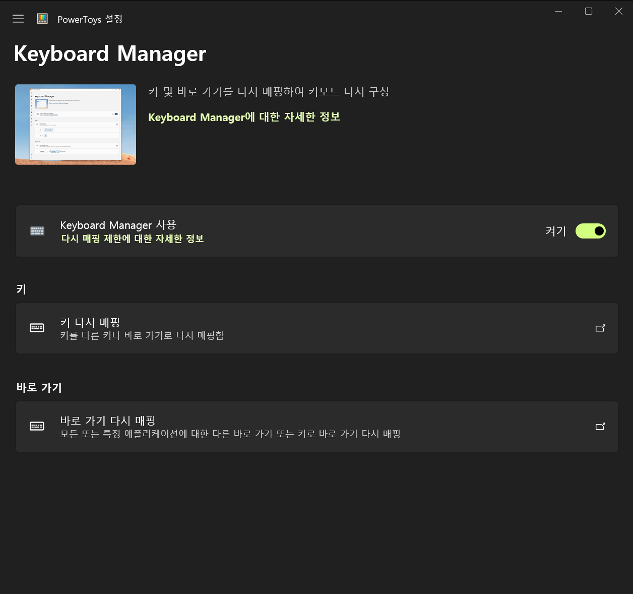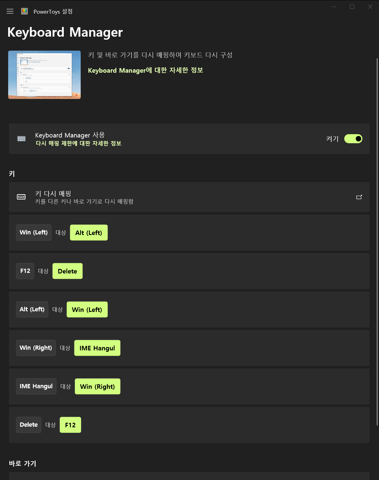 [Keyboard Manager]에 접근하여 설정을 변경하면 된다.