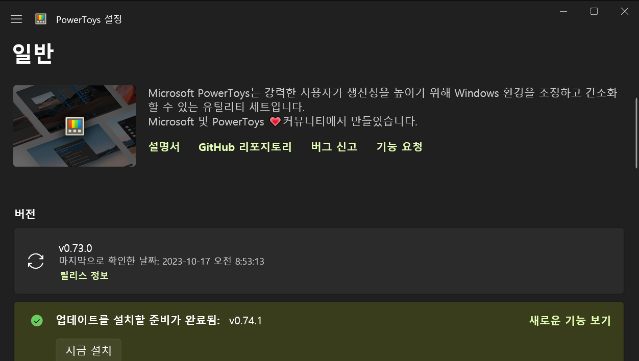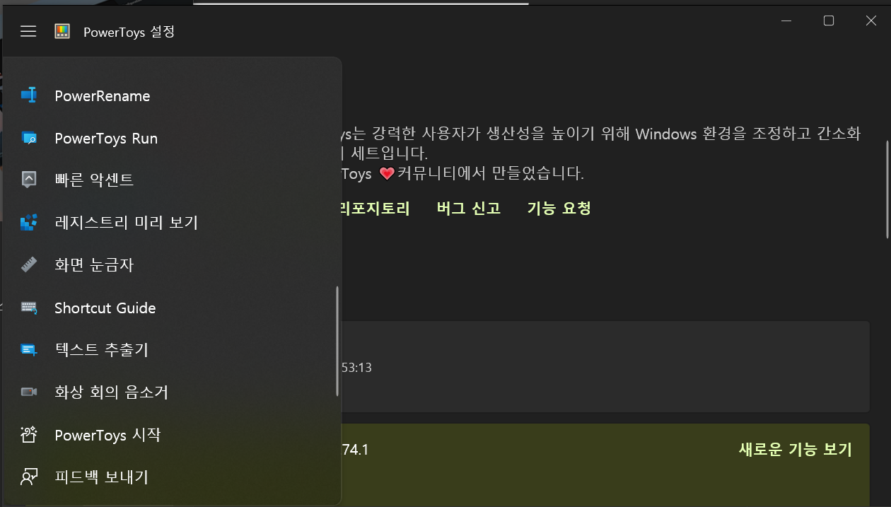 install을 한 후에 최초 설치시에는 PowerToys설정까지 바로 접근이 가능하다.