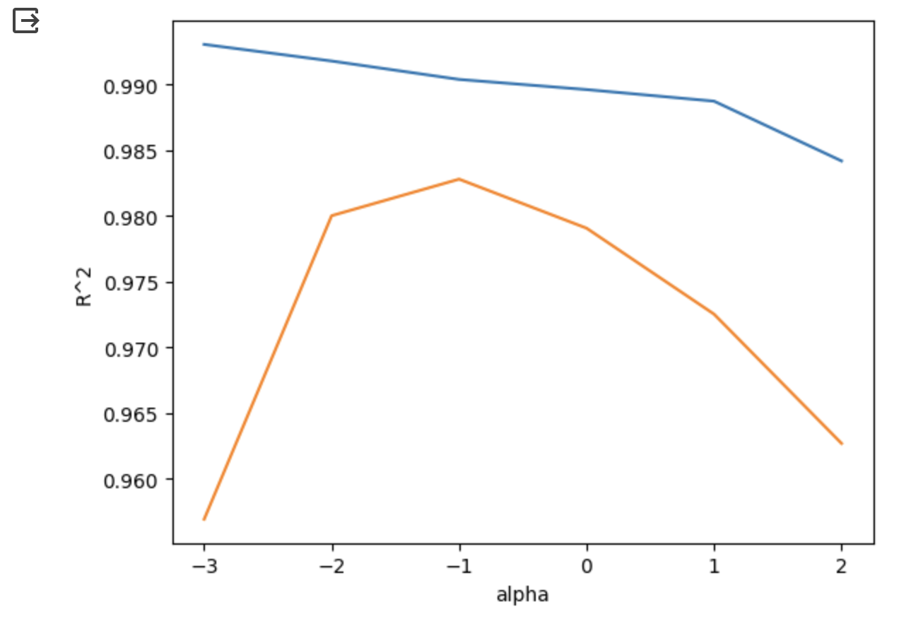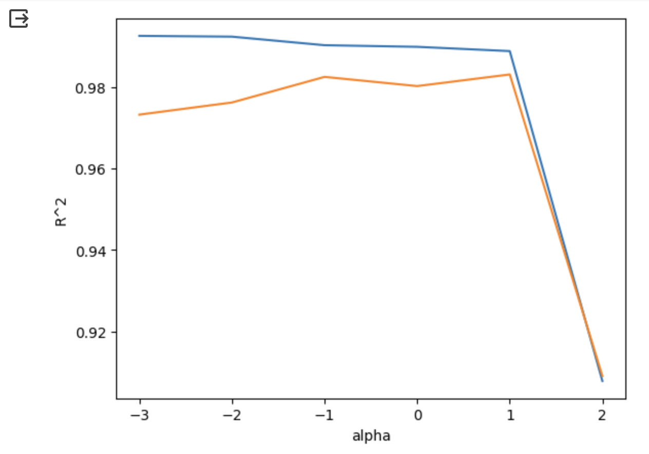 적절한 alpha값을 찾는 방법 중 하나는 alpha값에 대한 결정계수값의 그래프를 그리는 것이다.