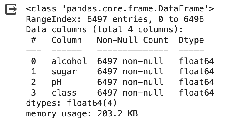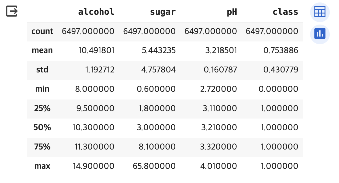 위 통계를 통해 알코올 도수와 당도, pH값의 스케일이 다르다는 것을 확인할 수 있다.