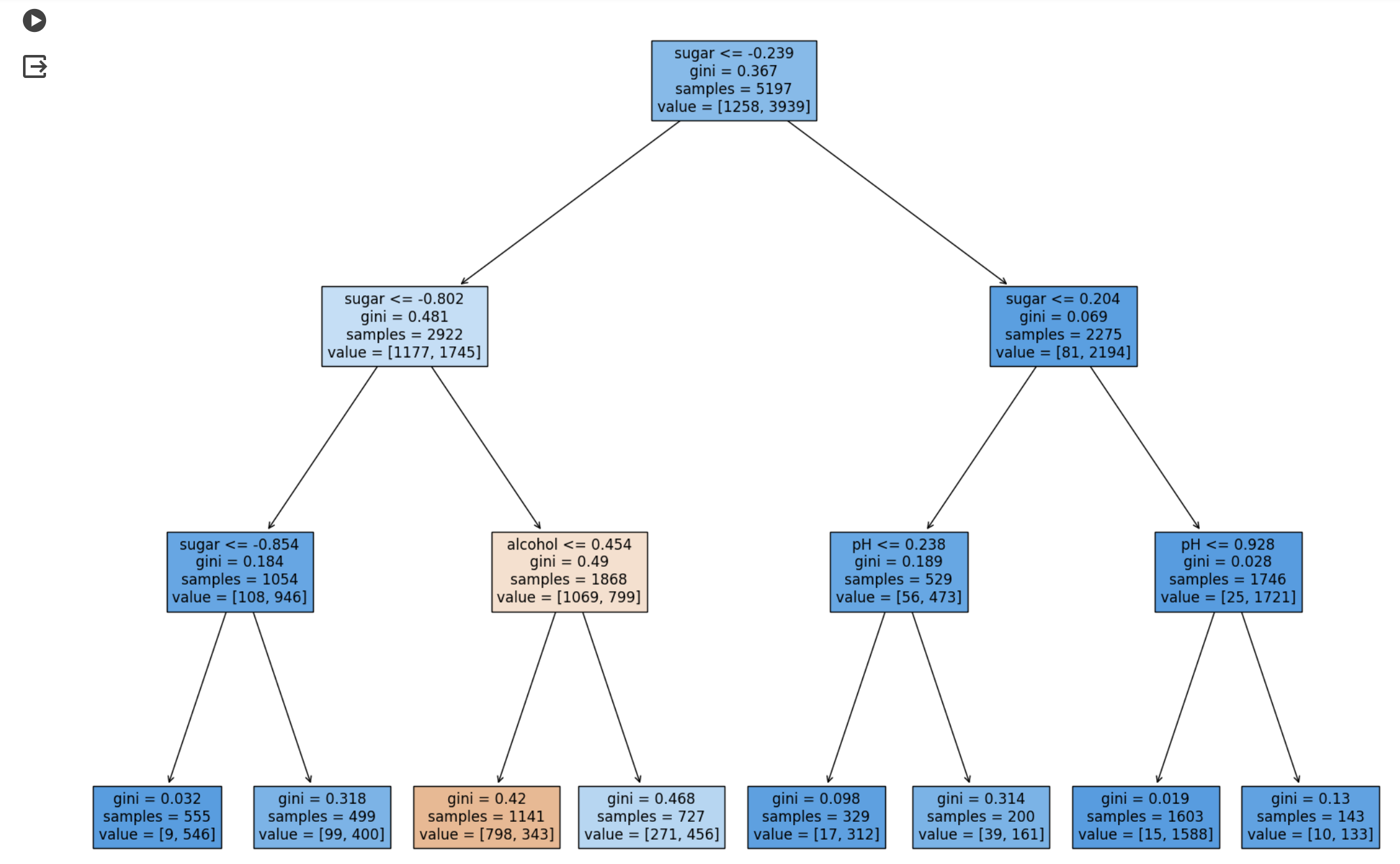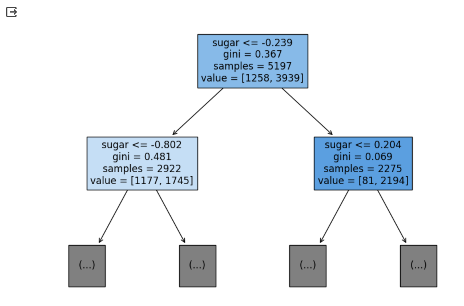 박스 내부는 테스트조건(sugar), 불순도(gini), 총 샘플 수(samples), 클래스별 샘플 수(value)로 이루어져 있다.