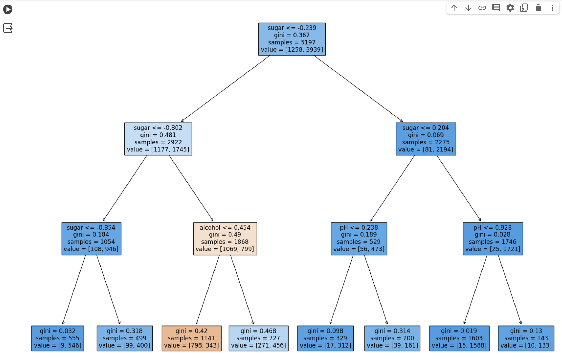 당도가 1.625보다 크고 4.325보다 작은 와인 중 알코올 도수가 11.025와 같거나 작은 것이 레드와인이라는 것을 확인할 수 있다.