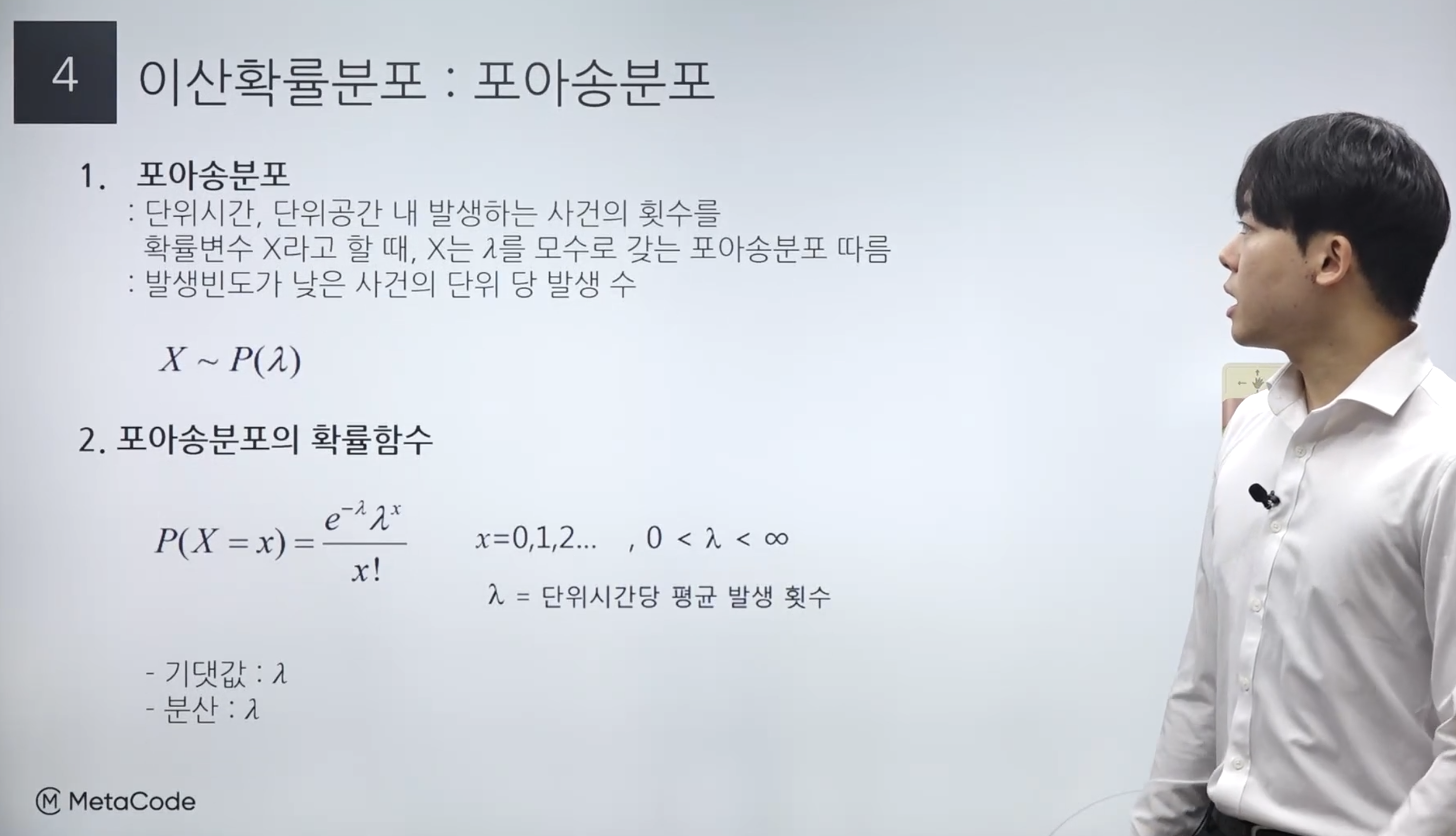 메타코드는 다양한 AI, 데이터분석 강의, 수학강의를 제공하는 곳입니다.유튜브, 메타코드 사이트에서 다양한 무료 강의를 제공받으실 수 있습니다.페이지 내에 다양한 이벤트도 포함되어 있어 AI,데이터 분석에 관심있으신 분들은 강의 수강과 더불어 다양한 이벤트도 참여해보시면 좋을 것 같습니다.표본 분포: 모집단에서 일정 크기로 표본을 뽑을 때, 그 표본의 통계량의 확률분포 표본평균의 평균과 표준편차 $$\bar{X} = \frac{\sum{x_i}}{n}$$ $$E(\bar{X}) = \mu$$$$Var(\bar{X}) = \frac{\sigma^2}{n}$$ 1. 평균이 μ, 표준편차 σ인 임의의 모집단으로부터 크기 n인 표본에서의 표본평균은 n이 크면 근사적으로 평균이 μ이고 분산은 아래와 같다.$$\f..